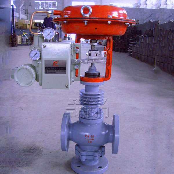SZJHQ气动薄膜三通合流调节阀、SZJHX型气动薄膜三通分流调节阀采用圆筒型薄壁窗口形阀芯导向,不同于柱塞形阀芯的衬套导向.配用多弹簧执行机构,具有结构简单、重量轻、体积小、拆装方便等优点.广泛应用于精确控制气体、液体等介质的工艺参加如压力、流量、温度、液位保持在给定值。适合于把一种流体通过三通阀分成二路流出或理把两种流体经三通阀合并成一种流体的场合气动薄膜三通调节阀有三通合流及三通分流两种.公称压力有PN16、40、64;公称通径范围DN25—300.适用流体温度由-60℃至+450℃。泄漏量标准为Ⅳ级。流量特性有直线、抛物线两种.